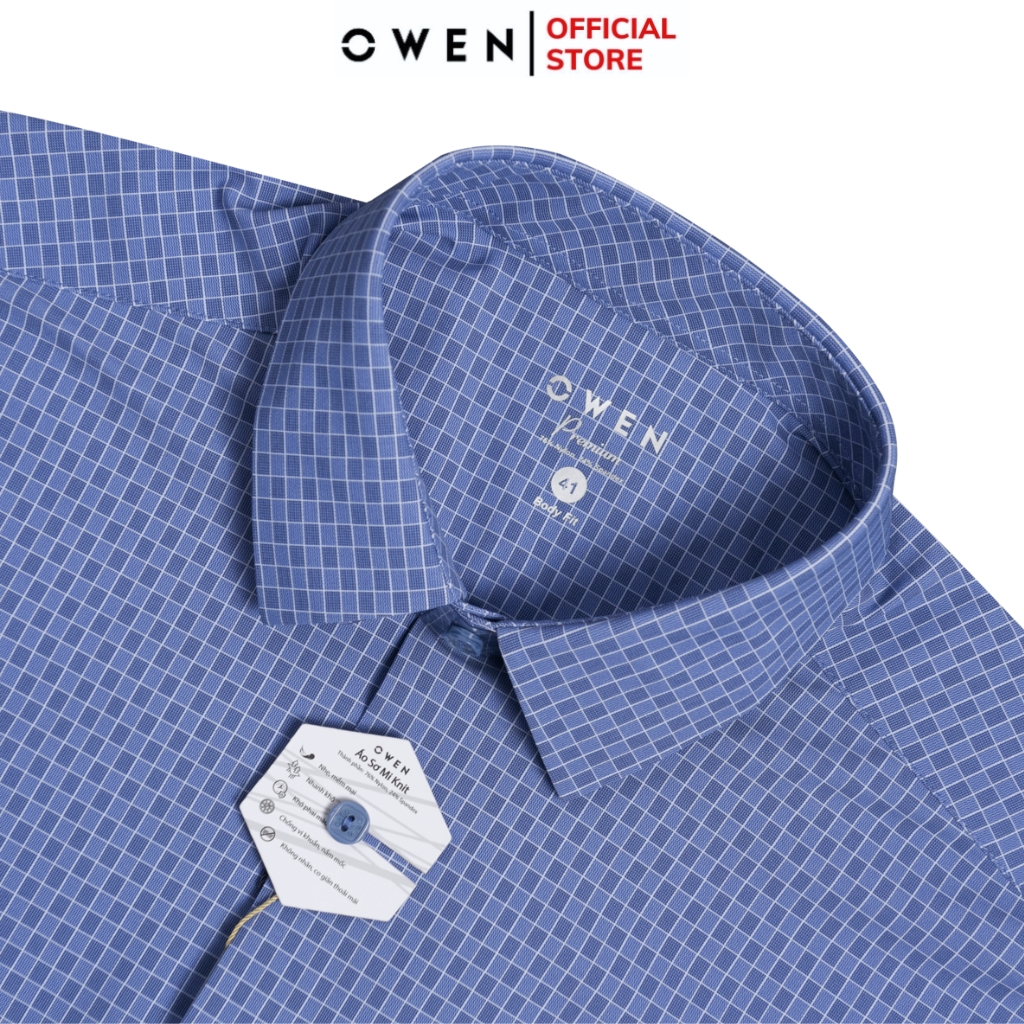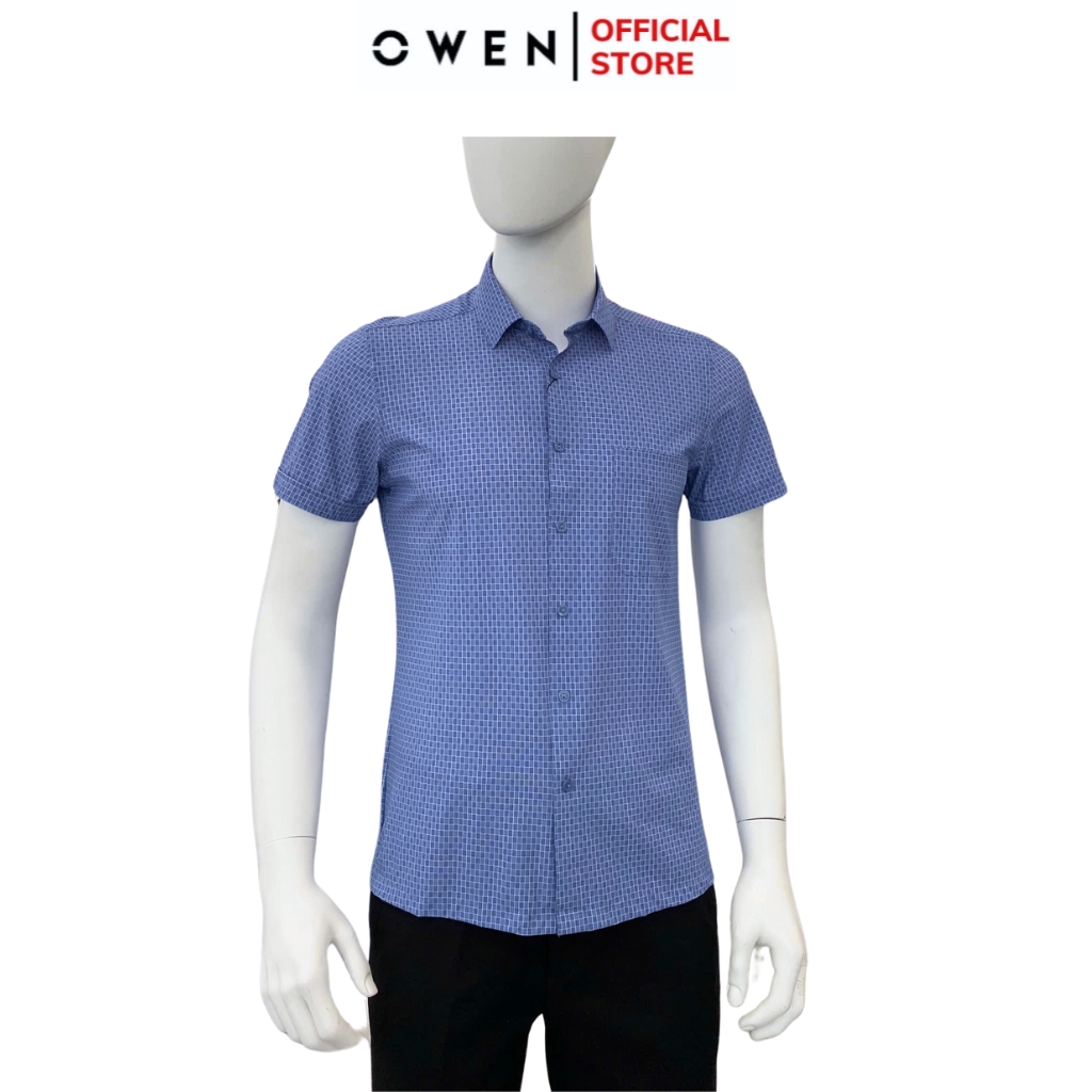 Áo sơ mi nam tay ngắn Owen AB250046NT màu xanh đậm kẻ caro nhỏ dáng suông body fit tà lượn có túi chất liệu knit