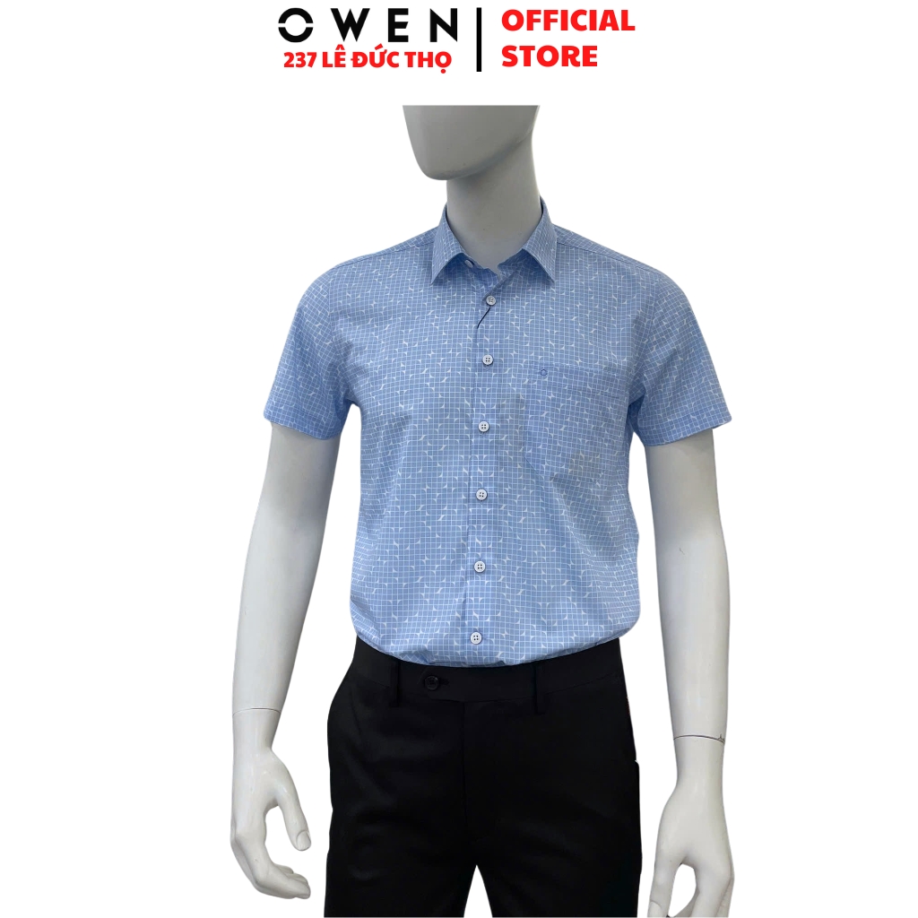 Áo sơ mi nam tay ngắn Owen AB260035NT màu xanh nhạt kẻ caro dáng suông body fit tà bằng có túi chất liệu modal polyester