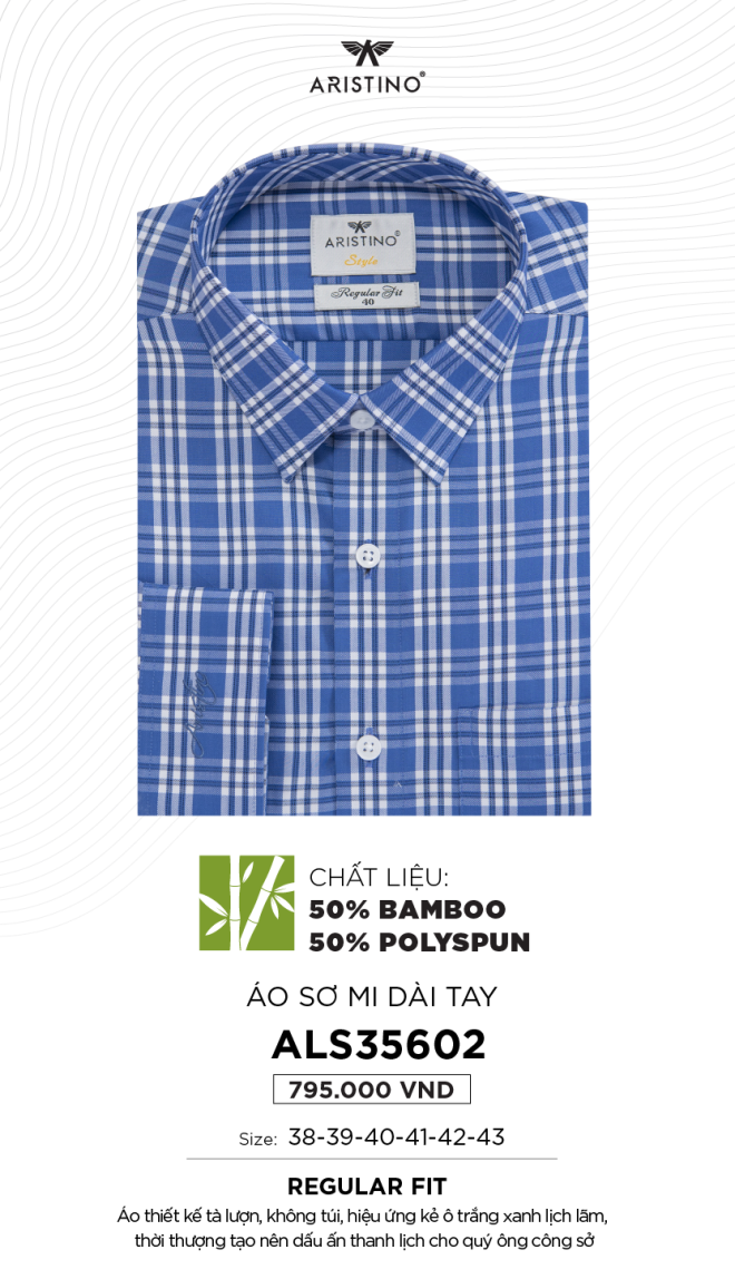 - Áo thiết kế tà lượn, có túi, hiệu ứng kẻ ô trắng xanh lịch lãm, thời thượng tạo nên dấu ấn thanh lịch cho quý ông công sở