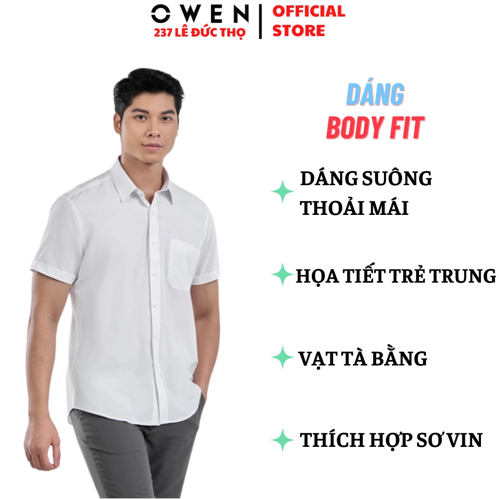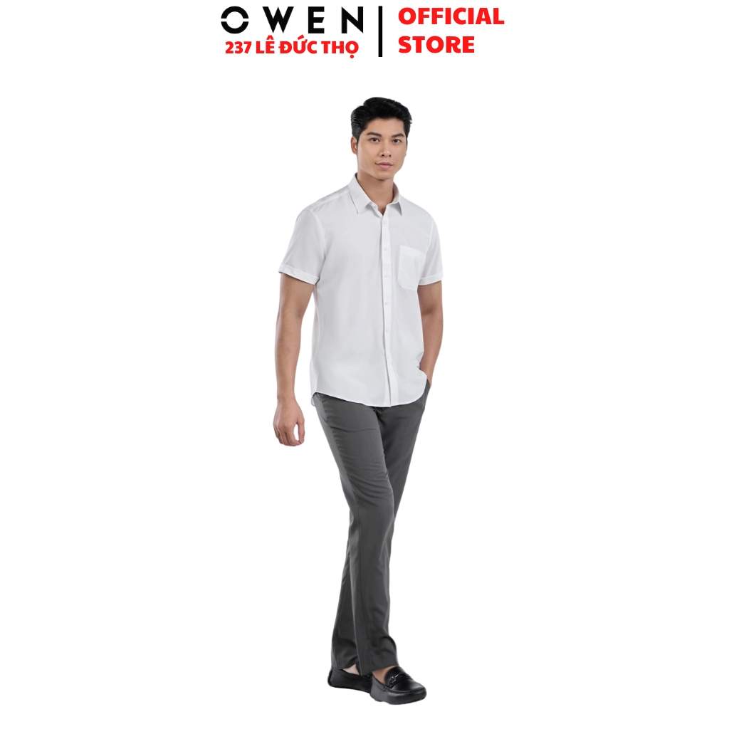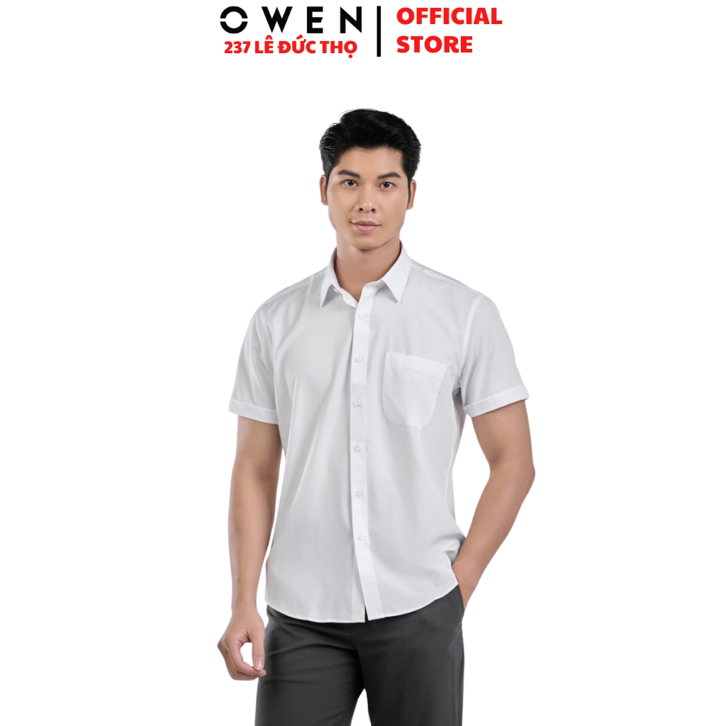 Áo sơ mi trắng nam tay ngắn Owen AR260502NTBF màu trắng trơn Dáng suông regular fit tà lượn có túi chất liệu nano