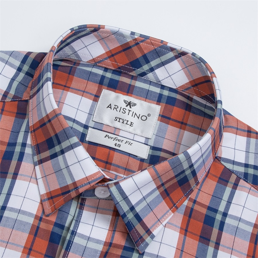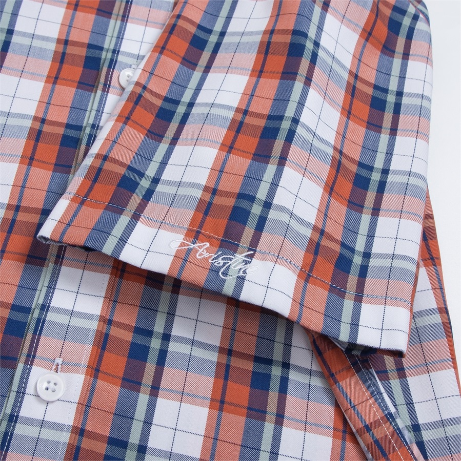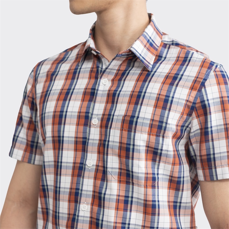- Thiết kế chỉn chu đến từng chi tiết với tà lượn, túi ngực. Họa tiết kẻ caro phối trắng cam mang tới vẻ thời thượng và ấn tượng cho quý ông