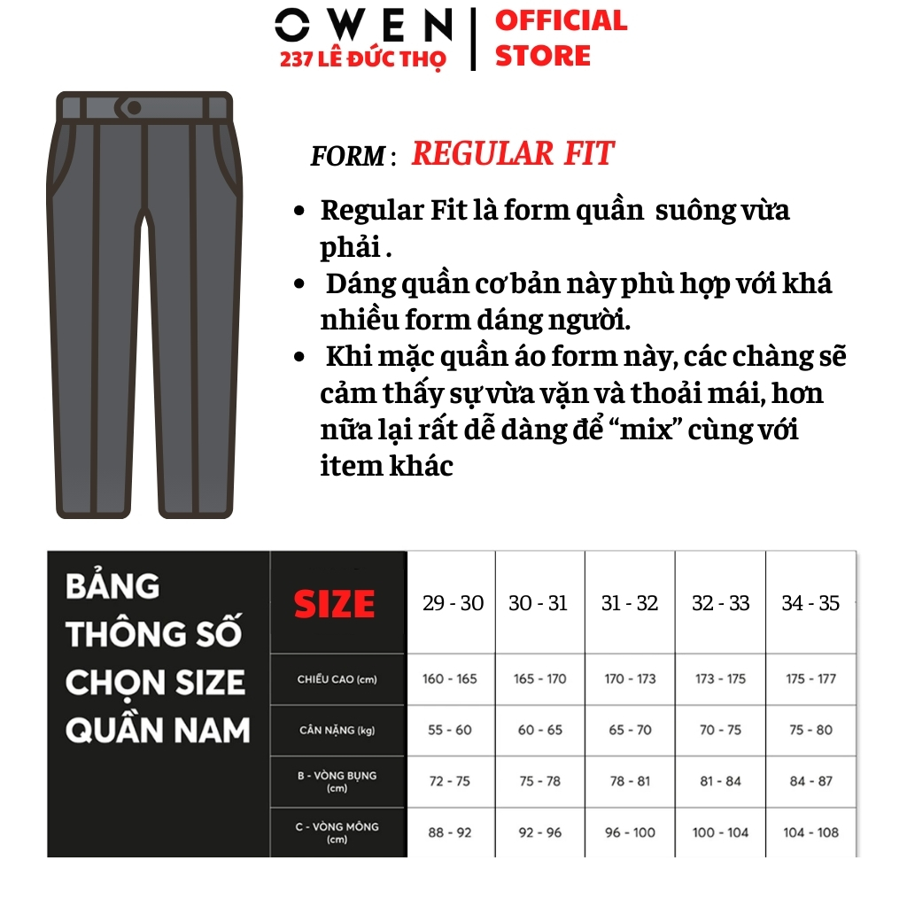 Quần âuCác mẫu Quần âu nam có mã sản phẩm bắt đầu bằng QRT hoặc QST là Quần Tây Nam Owen có cạp tăng đơ co dãn tăng vòng bụng tối đa 8cm ôm sát bụng đem lại cảm giác vừa vặn và thoải mái cho người mặc. Quần Âu có cạp co dãn nên mặc sẽ không bị bó bụng cả khi béo lên hoặc ăn no.