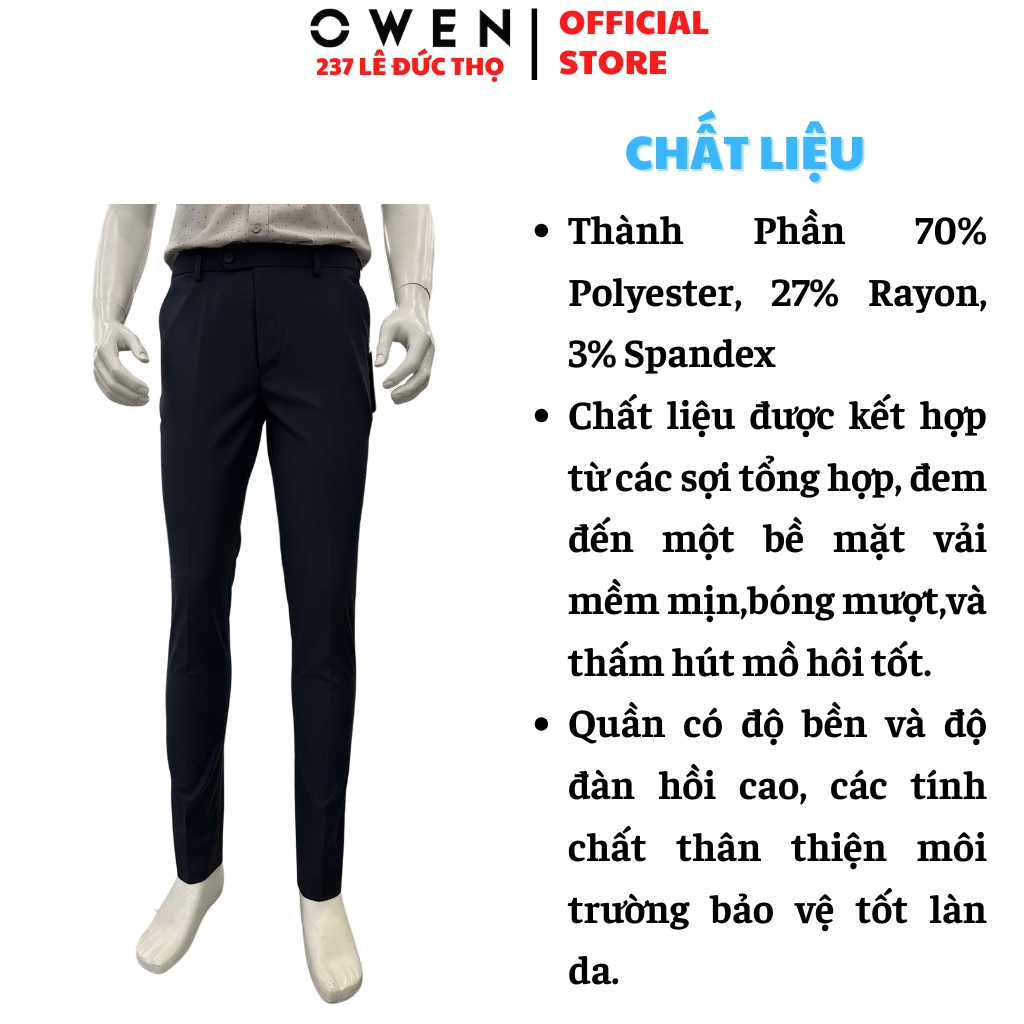Quần âuCác mẫu Quần âu nam có mã sản phẩm bắt đầu bằng QRT hoặc QST là Quần Tây Nam Owen có cạp tăng đơ co dãn tăng vòng bụng tối đa 8cm ôm sát bụng đem lại cảm giác vừa vặn và thoải mái cho người mặc. Quần Âu có cạp co dãn nên mặc sẽ không bị bó bụng cả khi béo lên hoặc ăn no.